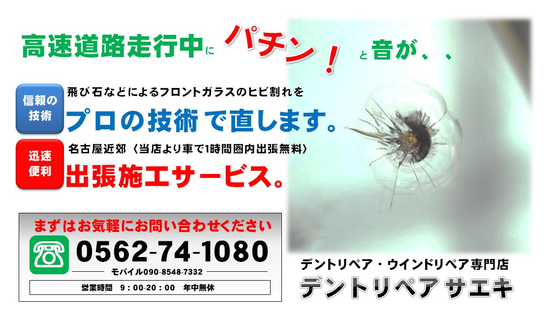 名古屋のガラスリペア ウインドリペア 専門店 飛び石などによる車のフロントガラスヒビ割れ修理 ガラスリペア ウインドリペア サービス専門店 12 000円 税別 箇所 デントリペア サエキ
